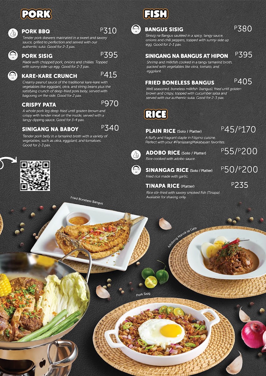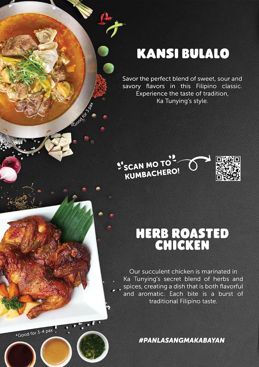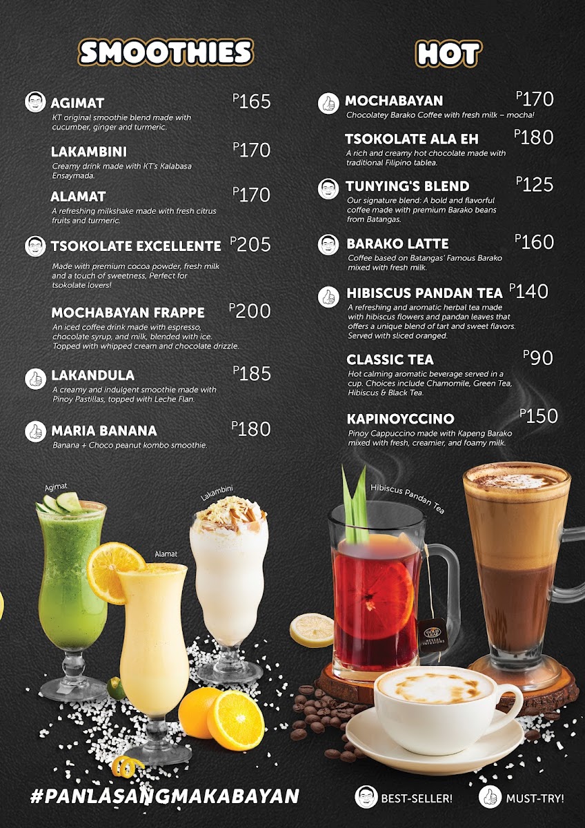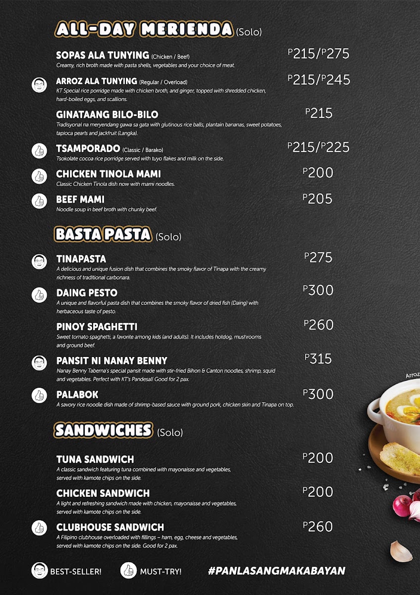 - All-Day Merienda: This section offers lighter dishes ideal for snack times or casual meals. Selections include the Chicken Sandwich served with kamote chips, the Daing Pesto pasta combining dried fish and pesto flavors, and Arroz Ala Tunying, a special rice porridge featuring chicken broth and ginger.