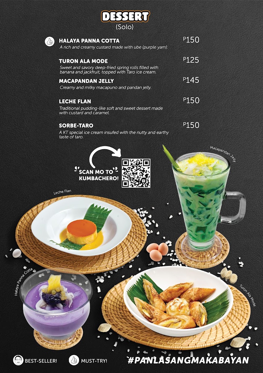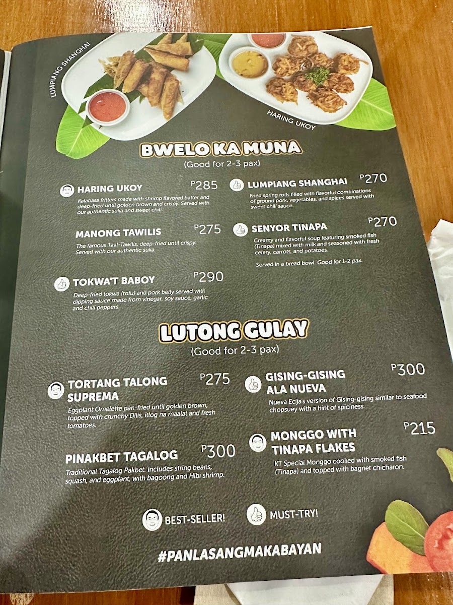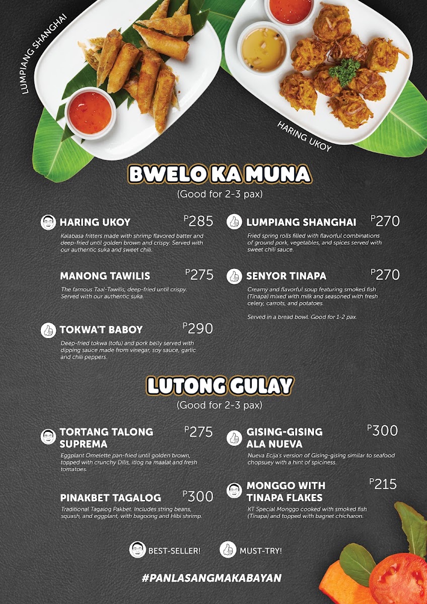 - All-Day Merienda: This section offers lighter dishes ideal for snack times or casual meals. Selections include the Chicken Sandwich served with kamote chips, the Daing Pesto pasta combining dried fish and pesto flavors, and Arroz Ala Tunying, a special rice porridge featuring chicken broth and ginger.