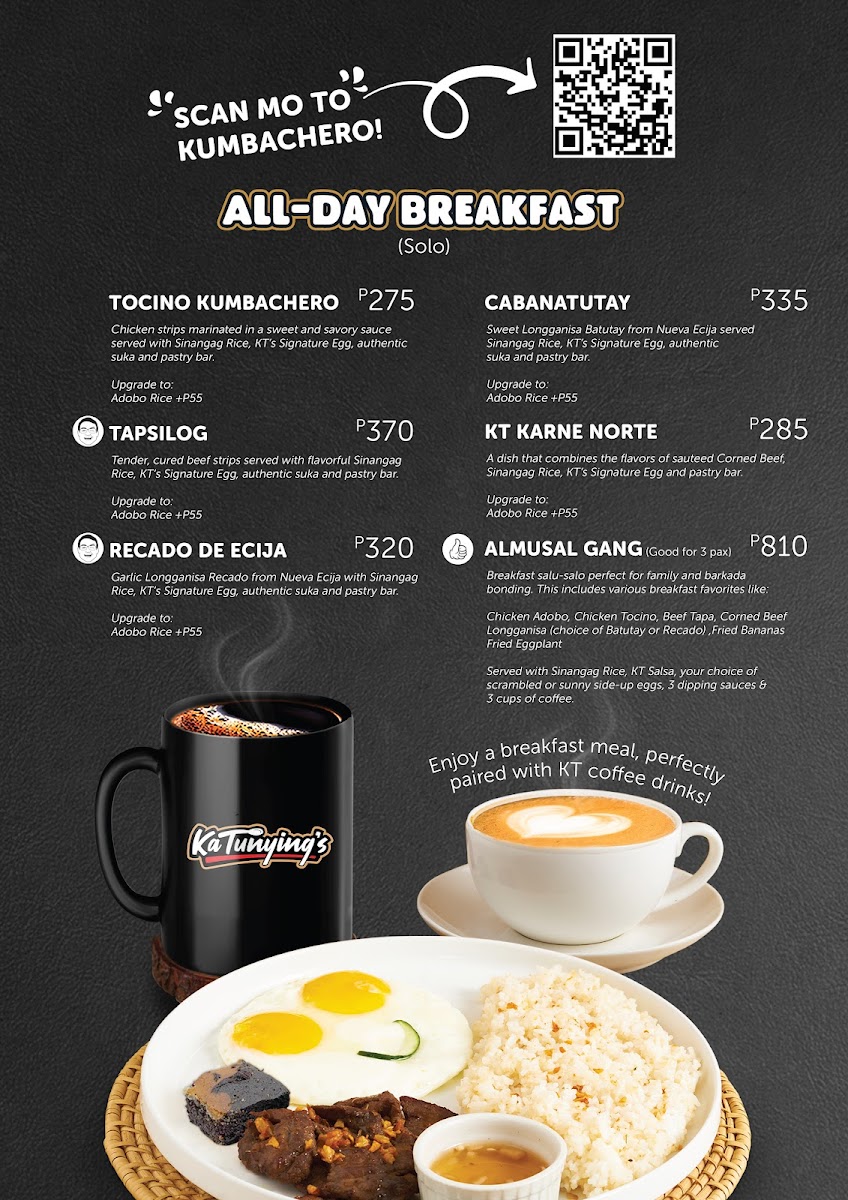 The menu at Ka Tunying's Tagaytay offers a variety of Filipino dishes and bakery items, structured to accommodate different dining needs, from quick meals to group gatherings. Visitors can explore several distinct groups within the menu, including group and party packages, all-day merienda options, and a selection of breads and pastries.